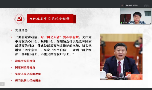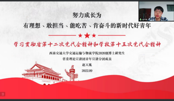 团委邀请四川省委宣讲团新时代文明实践青年宣讲分团团成员、西南交通大学青年讲师团成员赵天胤为“青马工程”精英班、骨干班成员、研究生会、学生会全体学生干部和2022级新生举办线上专题报告会。为落实属地疫情防控要求,报告会采取线上形式召开。