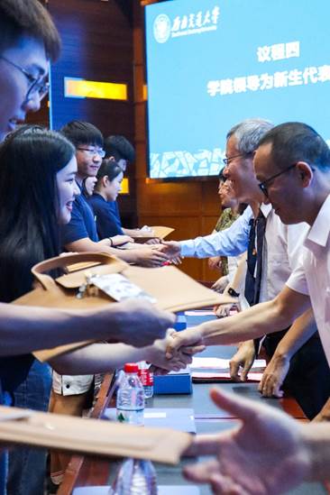 领导为新生代表赠礼。礼品既关注学生日常学习需求,又充满成都特色人文关怀,体现了足彩投注