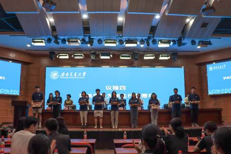 的期盼,抒发出23级新生们的青春豪气与理想追求。她希望大家端正学习态度,养成学习习惯,持续学习过程,历尽千帆、顶峰相见。王卉同学则通过分享自己曾在交大校园里看见过、参与过、感受过的故事与情感,从研究生的视角鼓舞大家保有好奇之秉性与尝试之勇气——既向内反思,做诚实的学问;又向外探索,做有用的人才。