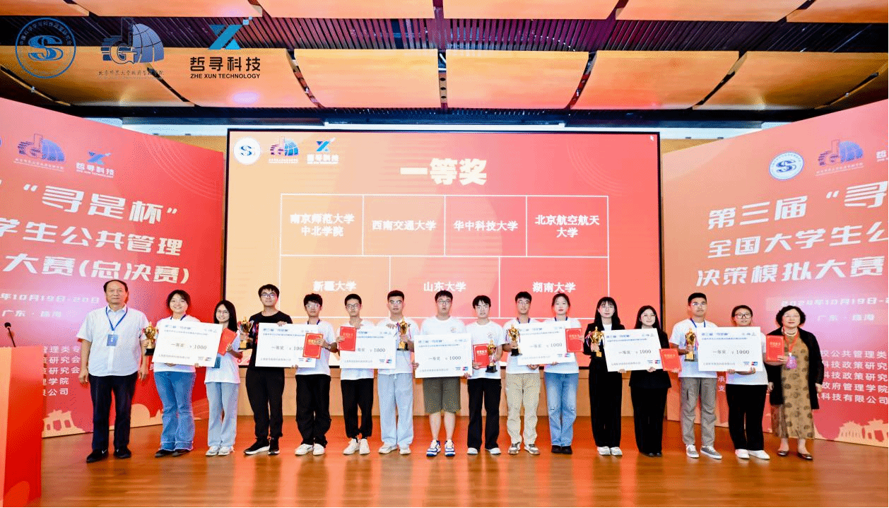 “寻是杯”全国大学生公共管理决策模拟大赛属于公共管理类全国性学科竞赛,采用公共管理方案设计、公共管理决策演练沙盘对抗、现场团队答辩的比赛模式,旨在通过数理模型的系统性思维、综合运用所学专业知识,在坚持问题导向中提升学生的公共管理实践能力,以赛促学、以赛促教,助力培养学科创新型人才。总决赛评委由15位公共管理学科的知名专家学者担任,本次大赛共有来自北京大学、中国人民大学、厦门大学、武汉大学、华中科技大学等90所高校的500余位师生参赛。