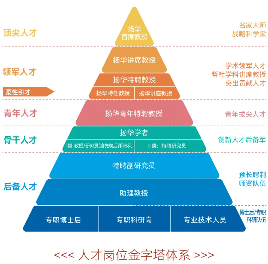 全新重塑“人才岗位金字塔体系”,以创新能力、质量、实效、贡献为导向,全新设置扬华教授、扬华学者、扬华讲座教授、扬华博士后、预—长聘制师资等5个序列16种人才师资岗位,促使各类人才“同台竞技”。系统优化“人才培育金字塔体系”,打造多类型多层级的人才培育支持体系,“一人一策”“一团一策”制定培育方案,多措并举提供全周期人才发展支持。