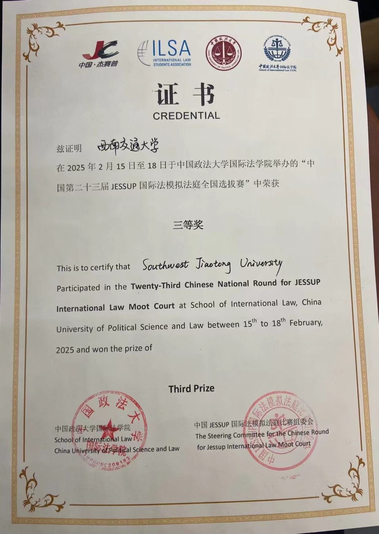 国际法教学、涉外法治人才培养理论与实践相辅相成的卓越成果,也为西南交大涉外模拟法庭的队伍建设与经验积累添砖加瓦。此次宝贵的参赛经历使选手们在国际法知识储备、法学前沿理论、专业法律检索、法律英语表达与英文辩论技能等方面获得深度锻炼与提升。