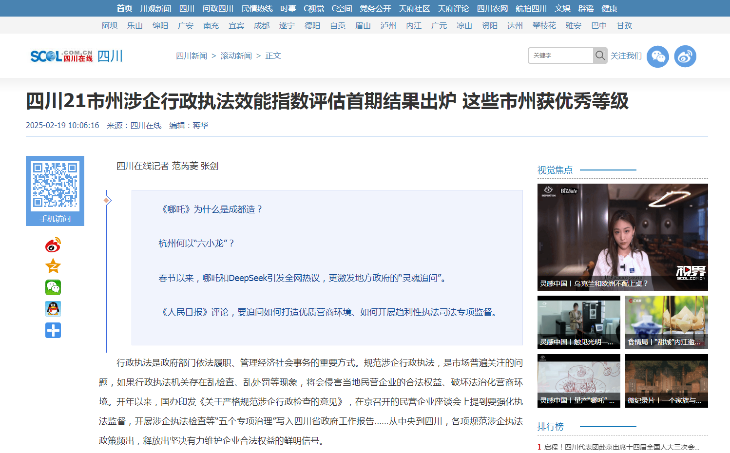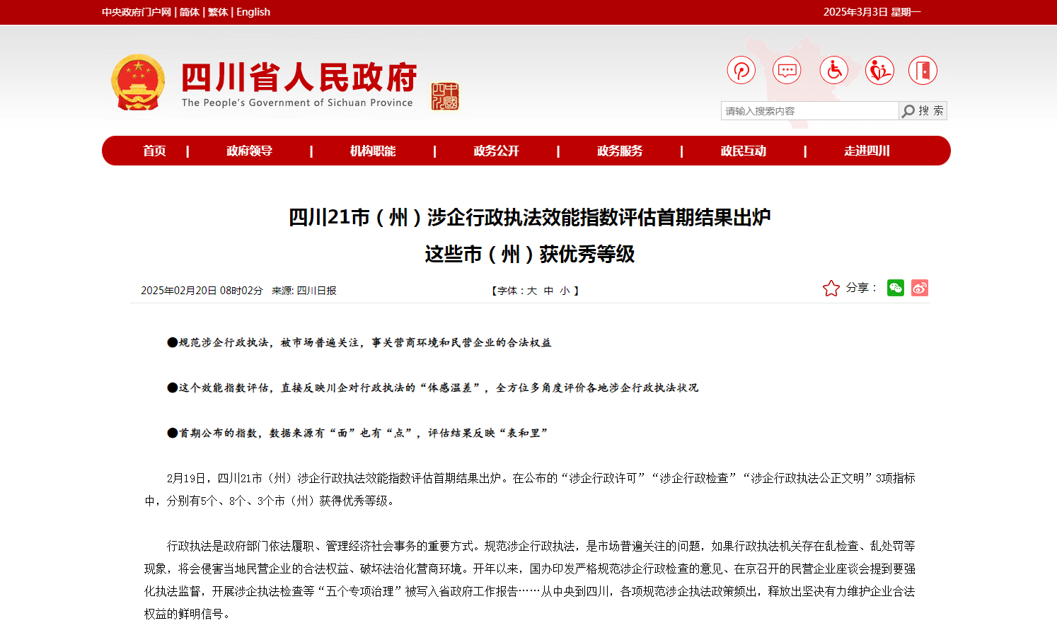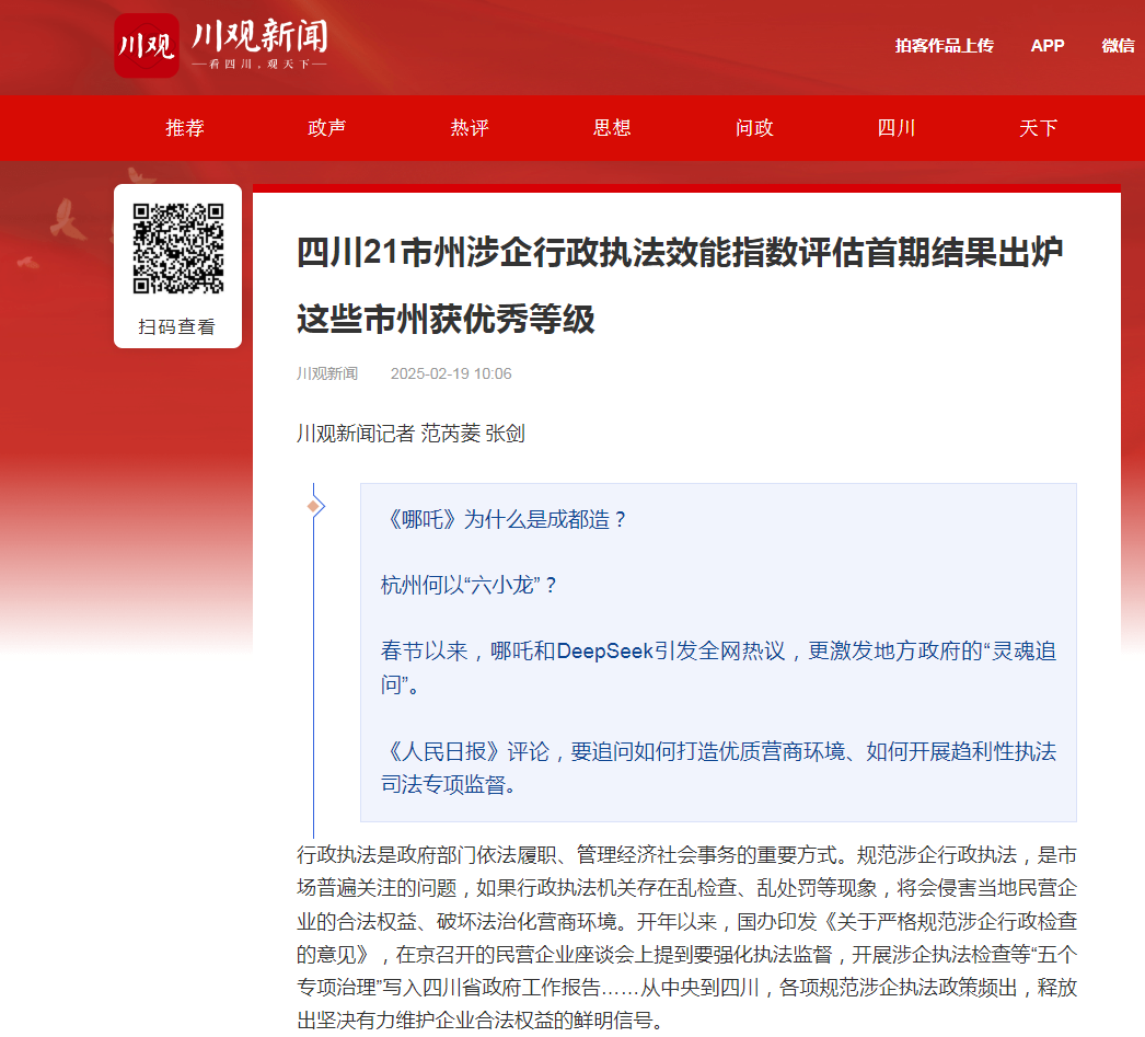 四川21市州涉企行政执法效能指数评估首期结果已于 2025年2 月 19 日在川观新闻(川观智库——四川综合新闻第一新媒体平台)正式发布。
