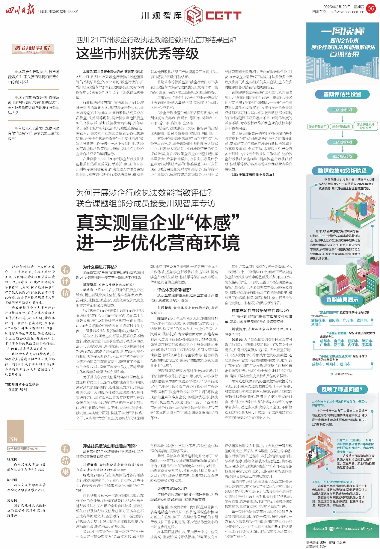 2025年2月20日,四川日报在头版将“四川21市州涉企行政执法效能指数评估首期结果出炉”的信息以倒头版的形式进行导读,并在四川日报第5版整版将首期评估结果公布,并就为何开展涉企行政执法效能评估、评估体系如何构建、评估工作如何有效开展等问题,对课题组成员杨成良副教授、陈迎新副教授和西南交通大学2006级法学研究生校友、资深律师吴爱民进行了专访。