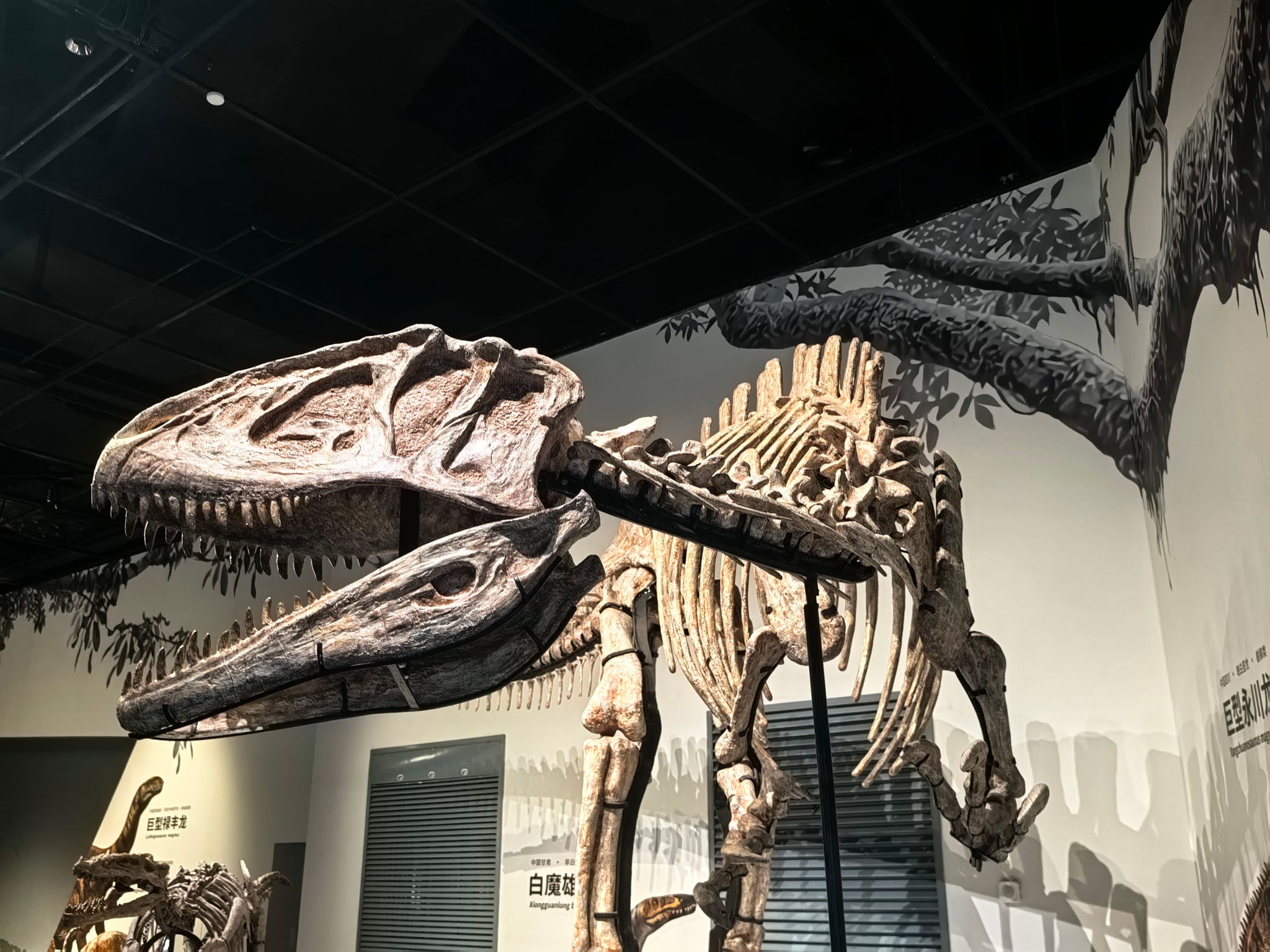 在“矿物宝石厅”,璀璨的水晶簇、莹润的和田玉、闪耀的金刚石标本在灯光下熠熠生辉,矿物结晶的几何美感与地质运动的鬼斧神工,让同学们惊叹于自然的神奇造化。踏入“恐龙王国”展厅,一具20米长的马门溪龙化石骨架巍然矗立,其蜿蜒的脖颈仿佛要冲破展厅穹顶。讲解员介绍,这具化石出土于四川宜宾,是侏罗纪晚期蜥脚类恐龙的代表。同学们围在“肉食恐龙与素食恐龙”互动展台前,通过触摸化石复制品,对比不同恐龙的牙齿结构,直观理解生物演化的生存智慧。