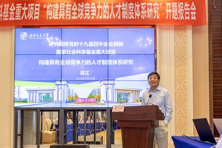 特聘教授吴江担任首席专家的研究阐释党的十九届四中全会精神国家社科基金重大项目“构建具有全球竞争力的人才制度体系研究”在成都金韵酒店凡尔赛厅顺利开题。西南交通大学党委副书记桂富强应邀参会并致欢迎词,四川省社科联党组副书记/副主席罗仲平、四川省社科联规划评奖办主任黄兵列席了会议。此外,课题指导专家、课题组成员等共计30余人参加了本次会议。