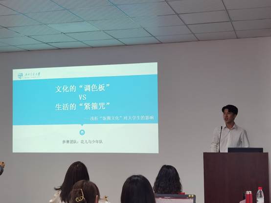 花儿与少年队的答辩题目是——文化的“调色板”VS生活的“紧箍咒,浅析“饭圈文化”对大学生的影响。他们通过爬取百度指数和微博评论进行背景的研究;在方案设计与实施阶段,利用了大数据文本分析,信度效度检验、交叉列联、单因素方差分析和因子分析等数据分析方法。他们调查得到,女性、低年级大学生是追星主力军,影视、音乐作品吸引度最高,多数大学生学习生活不受饭圈影响,理性消费观占据主体地位,大学生群体普遍持消极态度积极作用易被忽视。最后提出大学生要平衡学习生活与追星的尺度、合理规划追星支出、树立正确的追星观念;其他主体要加强网络媒体监管平衡、高校引导学生从偶像崇拜转向榜样崇拜、明星规范自身言行并承担公共责任。