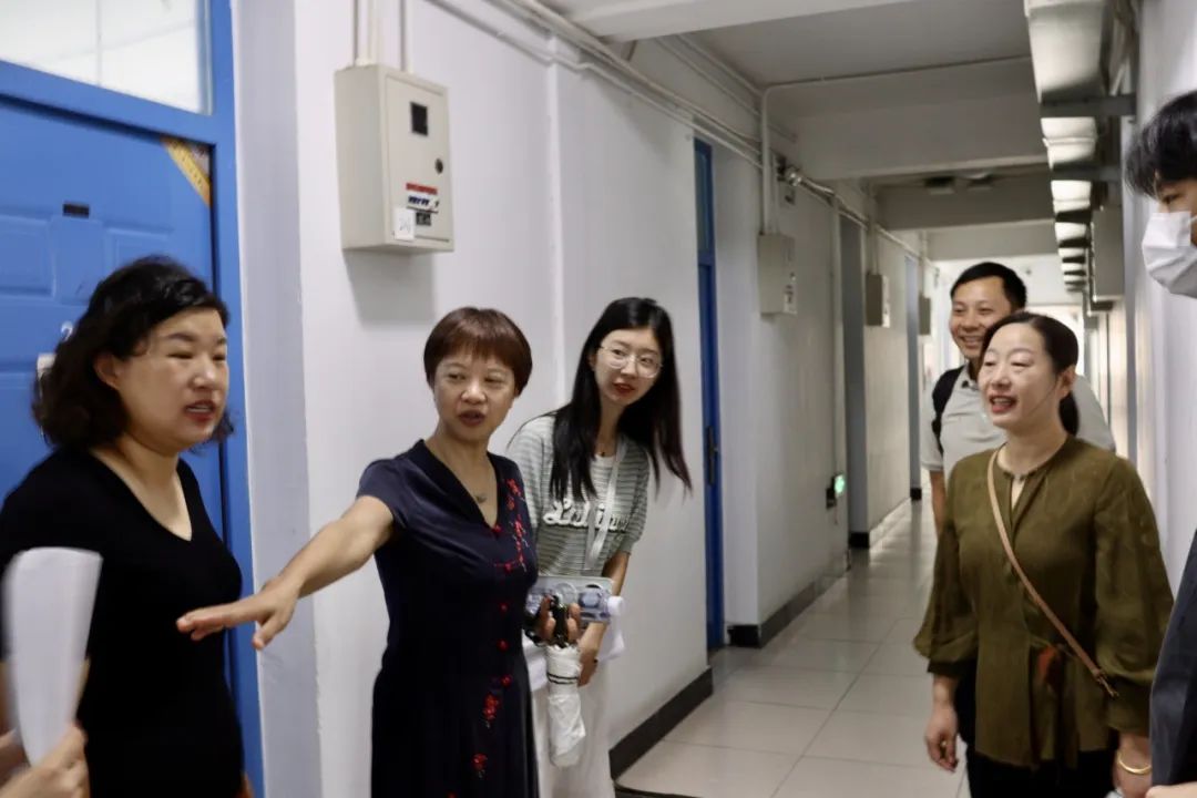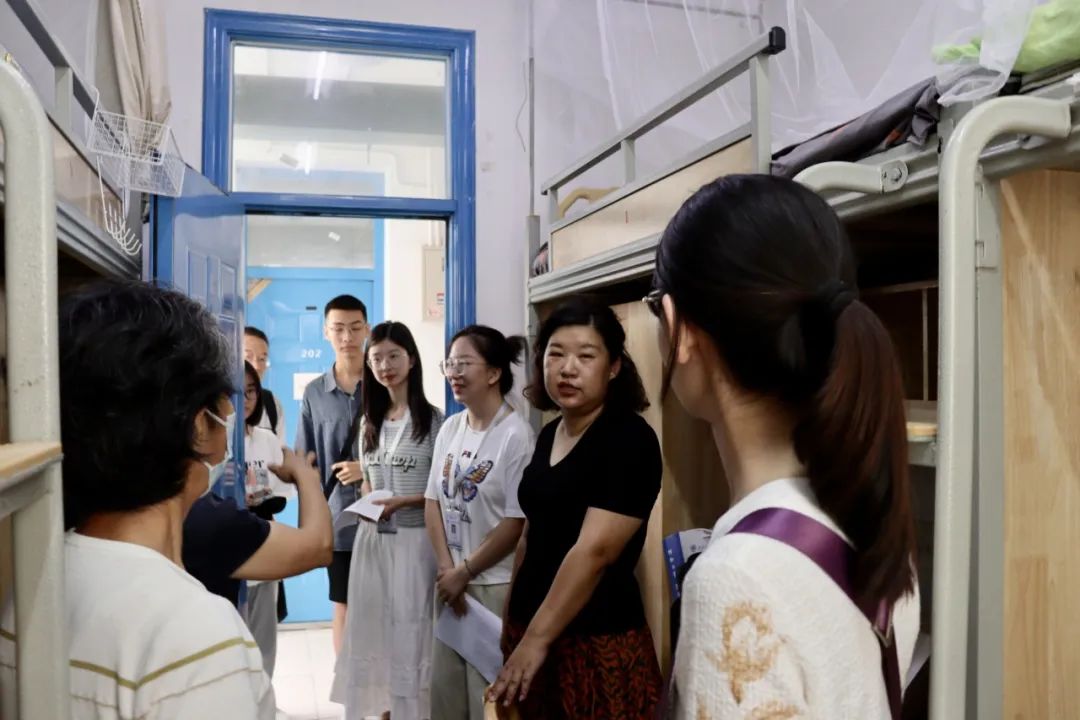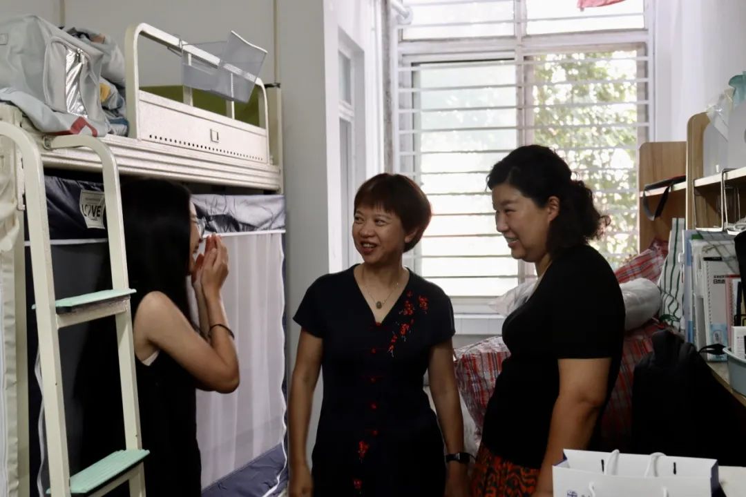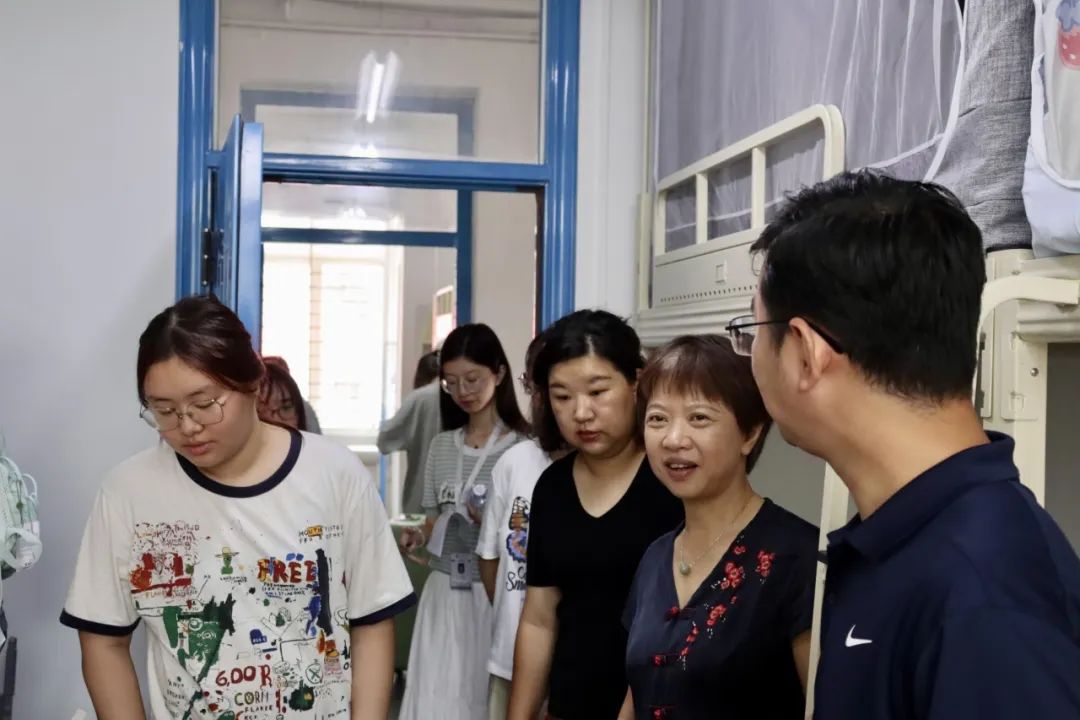 党委书记高凡,党委副书记、学工组组长薛婧和2024级研究生辅导员许楠、2024级本科生辅导员肖晨莹于2024年8月30日早9时30分,走访位于眷诚斋的新生宿舍,为公管新生们送去如家般的温暖与鼓舞。