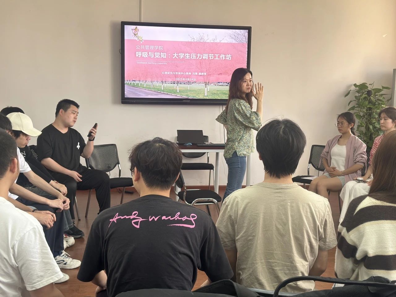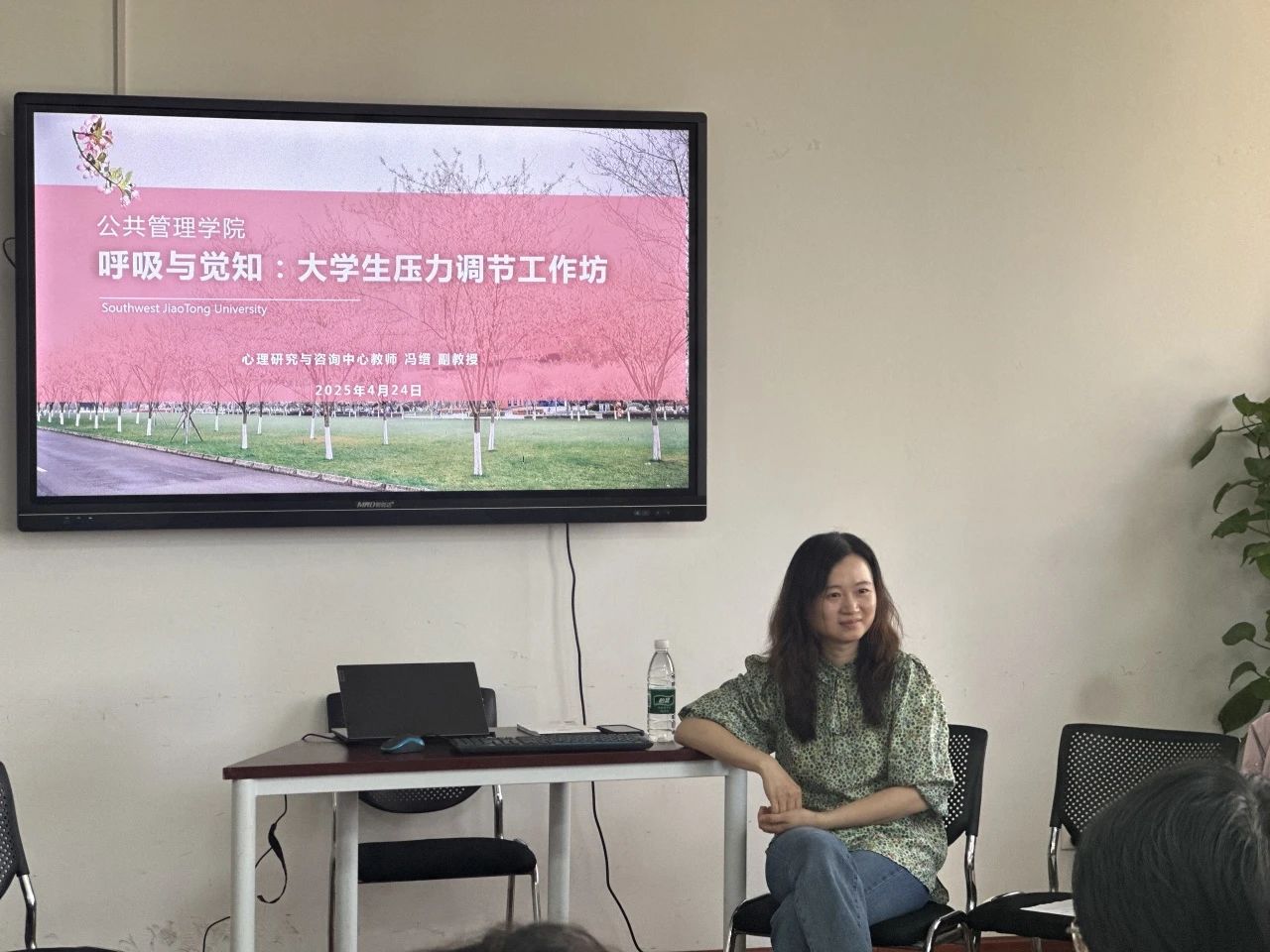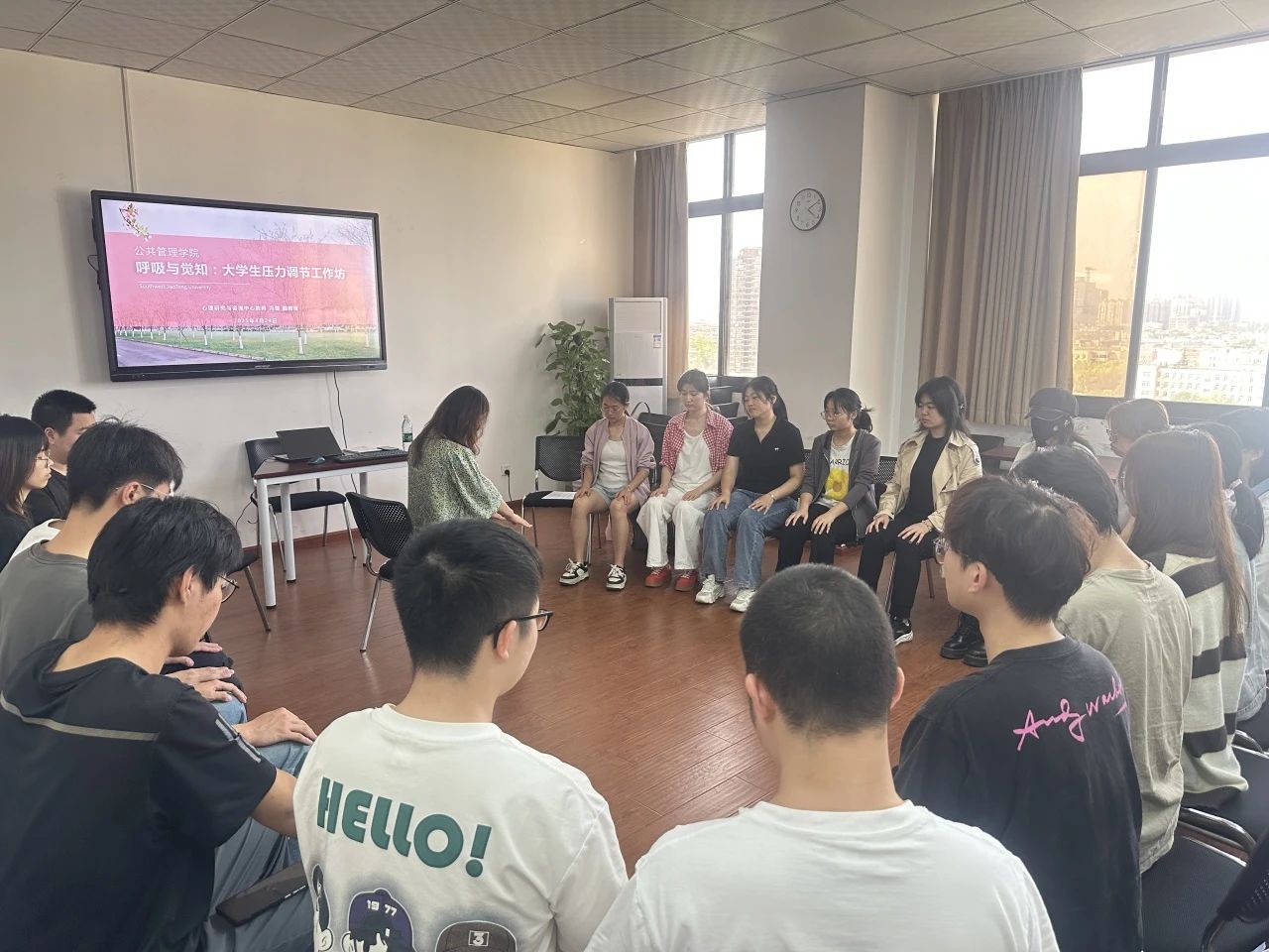 于4月24日下午4:00在0号教学楼01108教室开展“呼吸与觉知:大学生压力调节工作坊”活动。心理研究与咨询中心冯缙老师带领同学们进行了一场沉浸式的身心放松之旅。