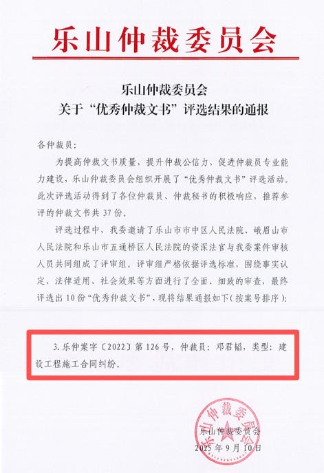 法学教师邓君韬副教授担任独任仲裁员的一件涉教育系统建设工程施工合同纠纷裁决书获评乐山仲裁委员会“优秀仲裁文书”。