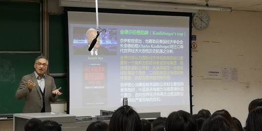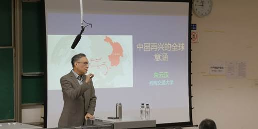 师生作“中国再兴的全球意涵”学术报告。报告由雷叙川副院长主持,陈光教授等众多教师及研究生参与。