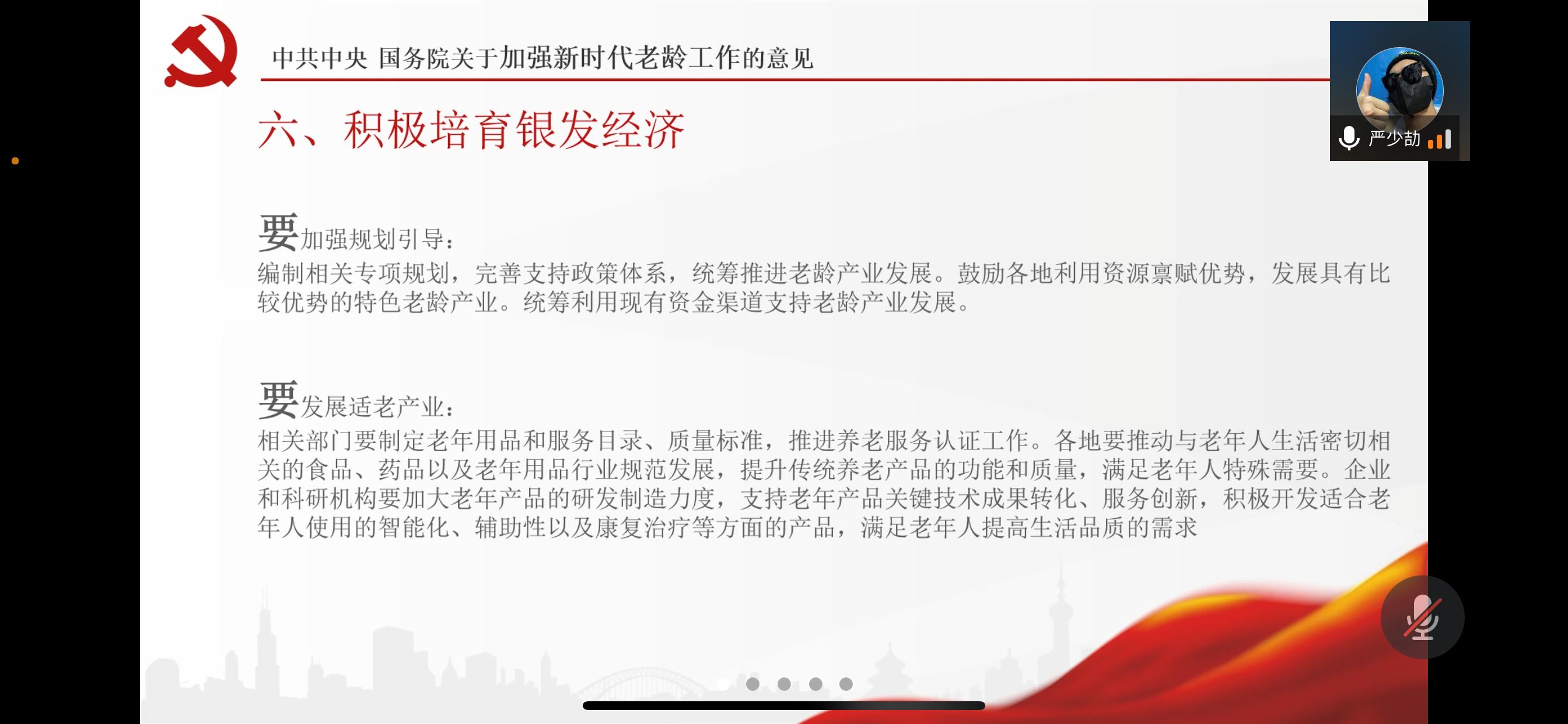 第一部分:由严少劼同志带领学习《中共中央国务院关于加强新时代老龄工作的意见》,为实施积极应对人口老龄化国家战略,加强新时代老龄工作,提升广大老年人的获得感、幸福感、安全感,《意见》指出要健全养老服务体系、完善老年人健康支撑体系、促进老年人社会参与、着力构建老年友好型社会、积极培育银发经济、强化老龄工作保障、加强组织实施等多项措施。大力弘扬中华民族孝亲敬老传统美德,促进老年人养老服务、健康服务、社会保障、社会参与、权益保障等统筹发展,推动老龄事业高质量发展,走出一条中国特色积极应对人口老龄化道路。