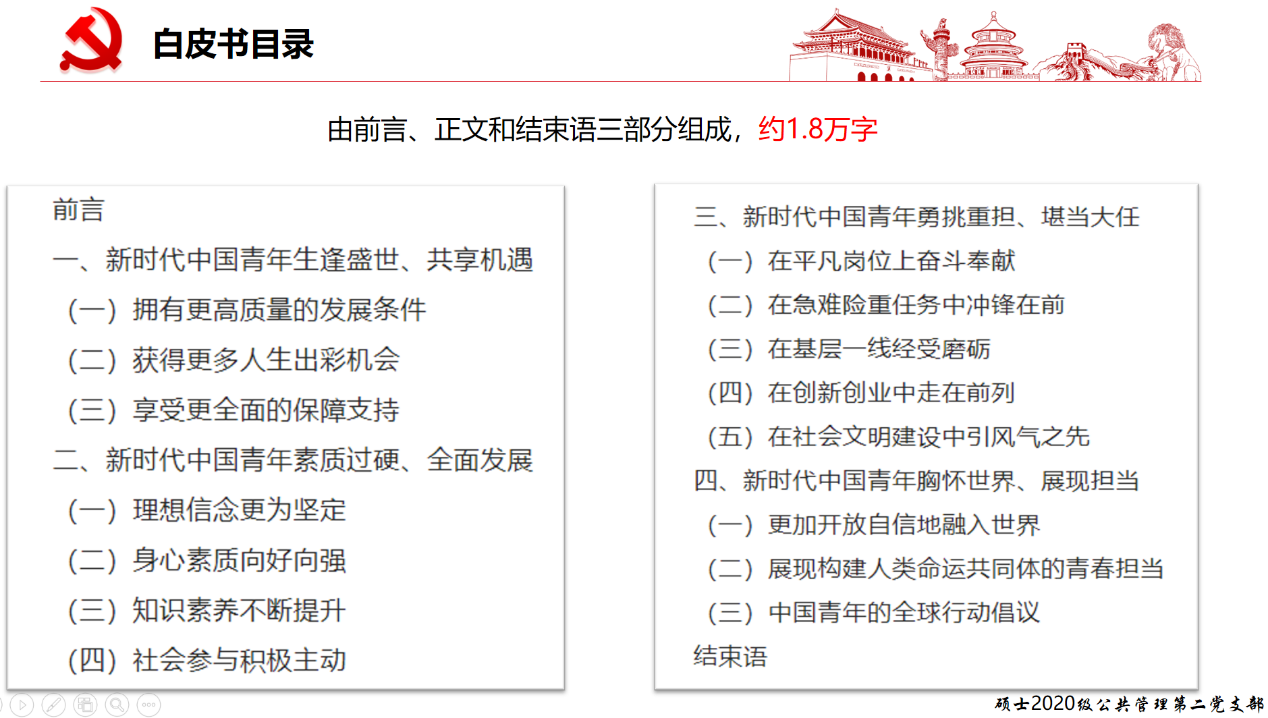 在内容详解部分,领学同志介绍了《新时代的中国青年》白皮书的目录大纲。然后,她从“前言”、“新时代青年生逢盛世、共享新机遇”、“新时代中国青年素质过硬、全面发展”、“新时代中国新青年勇挑重担、堪当大任”、“新时代中国青年胸怀世界、展现担当”、“结束语”等六个方面分享了白皮书的内容。