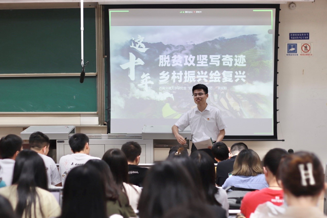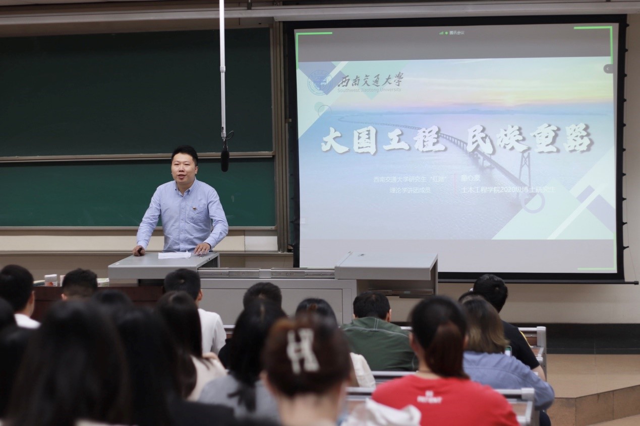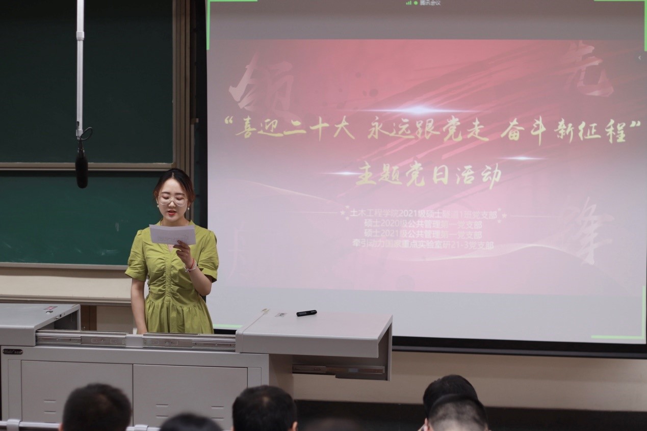2021级硕士隧道1班党支部联合硕士2020级公共管理第一党支部、硕士2021级公共管理第一党支部和牵引动力国家重点实验室研21-3党支部于J4323共同开展研究生党建“领航先锋”工程——“喜迎二十大、永远跟党走、奋进新征程”主题党日活动。本次活动有幸邀请到三位研究生“红路”理论学讲团成员——韩沁儒、童心豪、黄斌翰为大家带来精彩的宣讲。