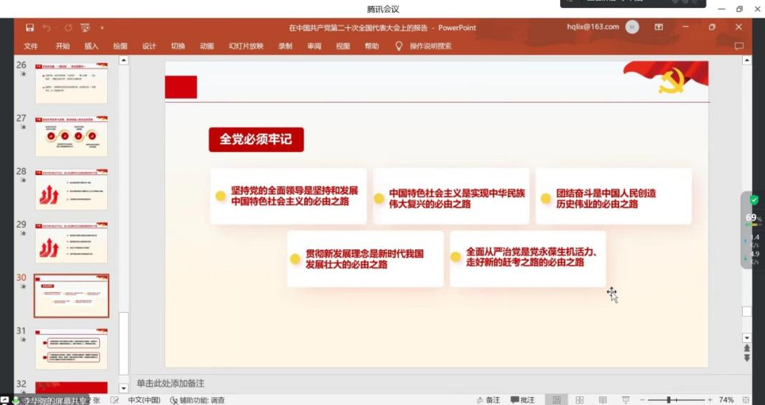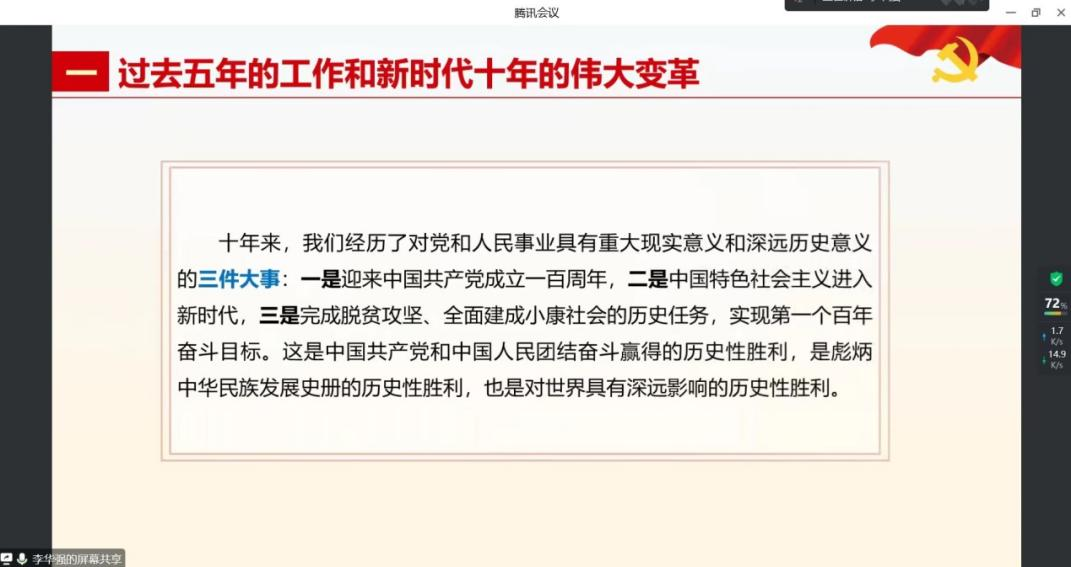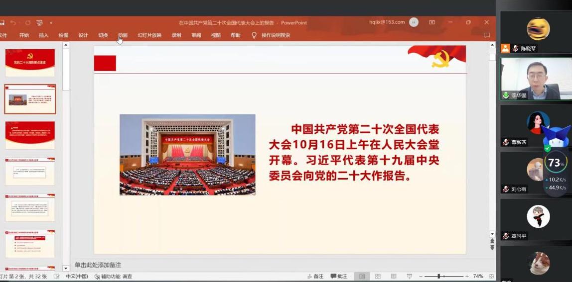 党委委员、副院长李华强在腾讯会议开展了党的二十大精神专题宣讲活动,教工机关党支部、硕士2020级公管第一党支部、硕士2022级公管资环第二党支部的全体党员参加。