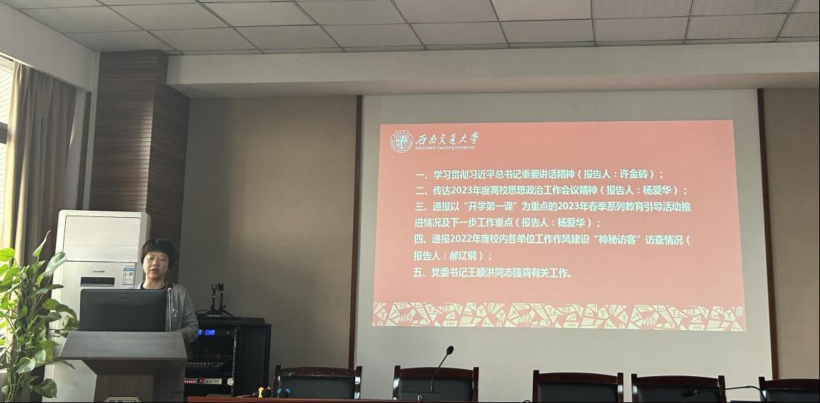 党委书记高凡传达了习近平总书记在中共中央政治局常务委员会会议上的重要讲话精神、2023年教育系统全面从严治党工作视频会议精神、2023年度高校思想政治工作会议精神及学校2023年春季学期党委书记工作会议内容。