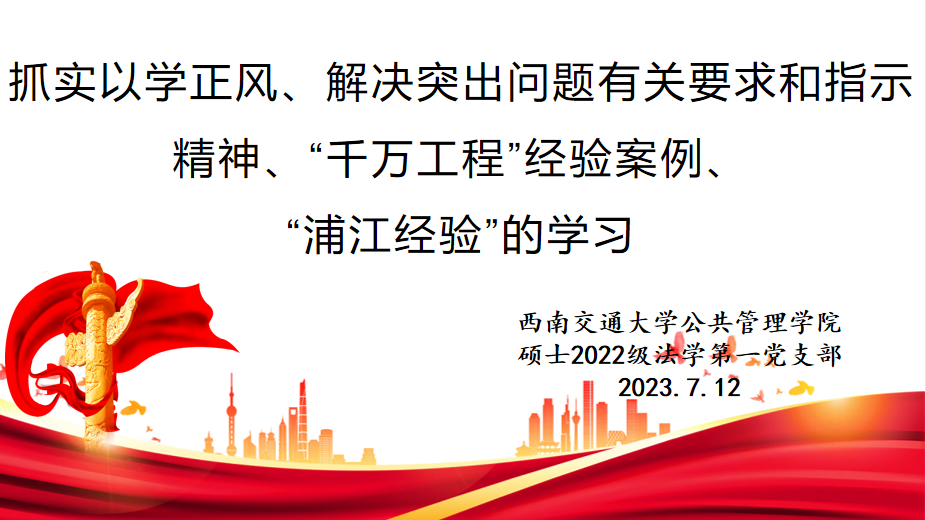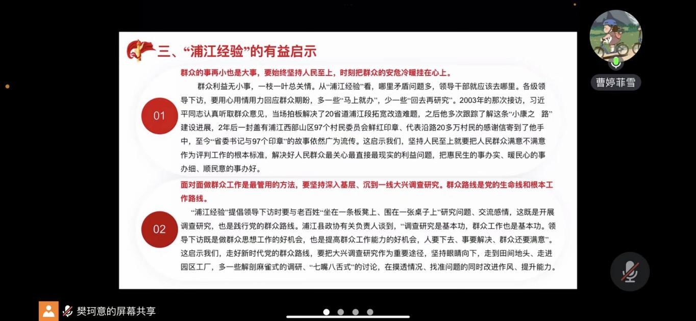 硕士2022级法学第一党支部于线上腾讯会议开展“习近平总书记在内蒙古调研时对抓实以学正风、解决突出问题有关要求和指示精神、‘千万工程’经验案例,学习运用好‘浦江经验’”主题教育政治理论学习。本次学习由第二党小组同志主讲,全体党员和入党积极分子参加。