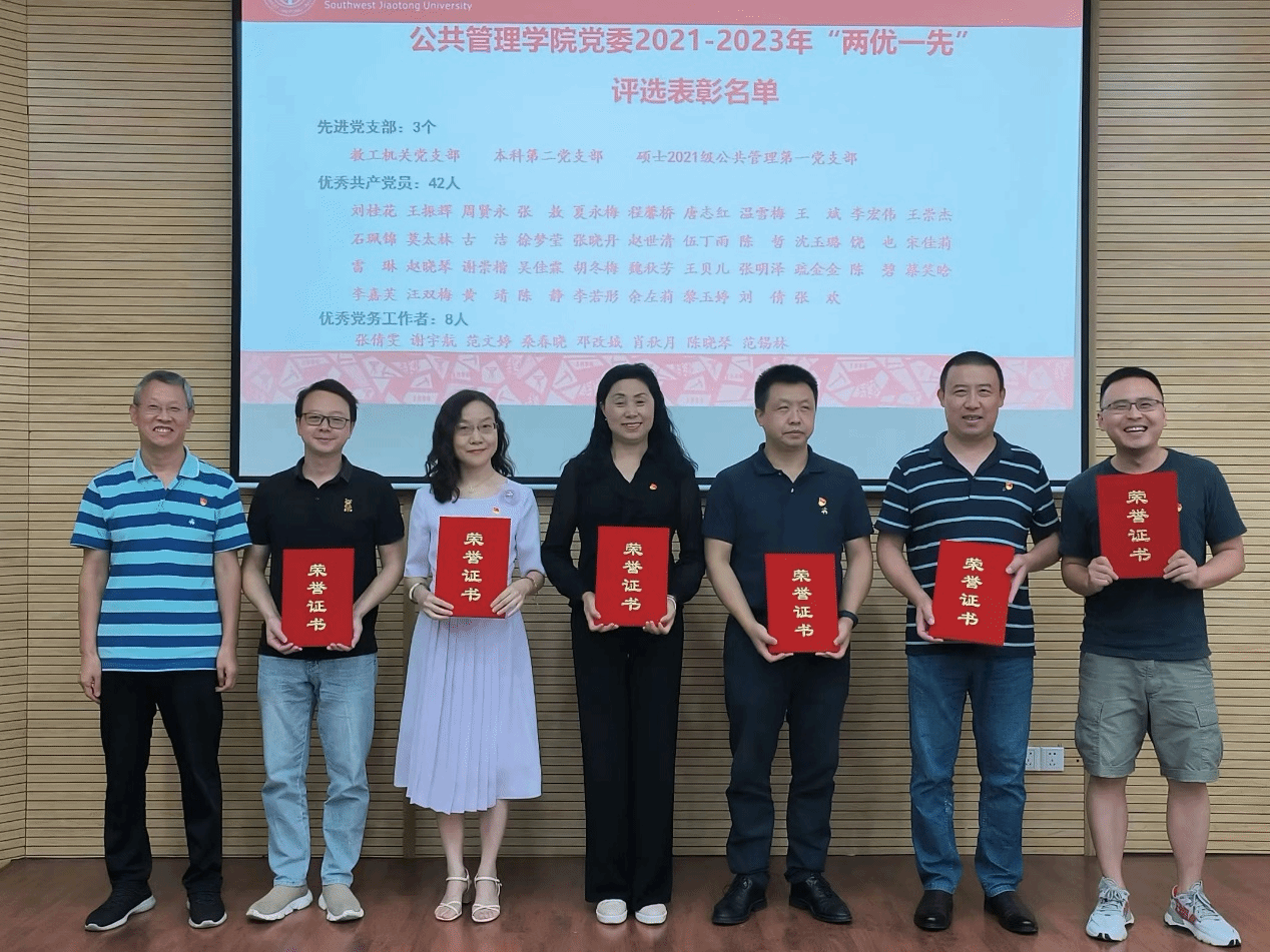 为在2021-2023年“两优一先”和第二届“立德树人”先进集体和个人评奖活动中表现优异的先进集体和个人进行了表彰。其中,教工机关党支部、刘桂花、张倩雯等53个集体和个人分别获评“先进党支部”、“优秀共产党员”、“优秀党务工作者”等称号。社会风险与应急管理团队、交通与国家治理团队、陈光、邓君韬、李东坤等11个集体和个人分别获评“立德树人先进集体”、“立德树人成就奖”等奖项。
