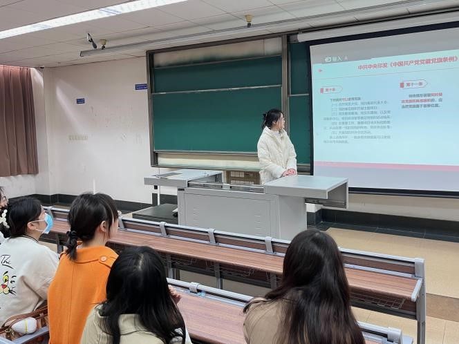 其余小组选择线下集中的方式,在教室内围绕《建设开放包容、互联互通、共同发展的世界》和《中国共产党党徽党旗条例》,分专题进行研讨,并且以逐条领读、专项报告等形式开展学习。每位同学在学习后都轮流在讲台上进行了三分钟的感悟分享,同学们分别从自身出发,从理论出发,谈作为青年党员应该如何参与到美好世界建设、担当起自身责任。在有关《中国共产党党徽党旗条例》交流中,不少同学提到:之前对于党徽党旗缺乏正确的认识,通过本次学习已经能够正确认识党徽党旗的深刻内涵与工作要求,并且在今后的工作生活中会规范使用党徽党旗及其图案。