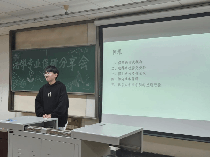 本科法学党支部于2023年11月10日开展“经验共分享,再谱新篇章”主题党日活动,邀请2020级韩蒙恩(保研至北京大学)、向芯雨(保研至四川大学)、钟祺(保研至重庆大学)为支部成员以及低年级同学带来保研经验分享,并进行答疑解惑。