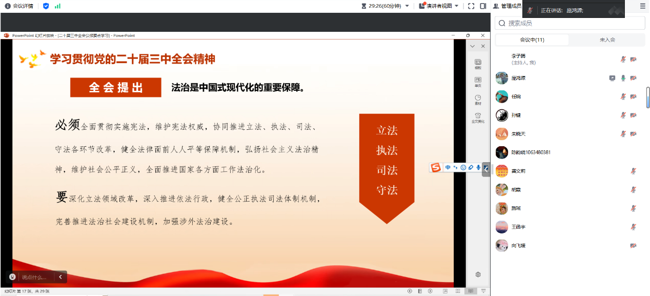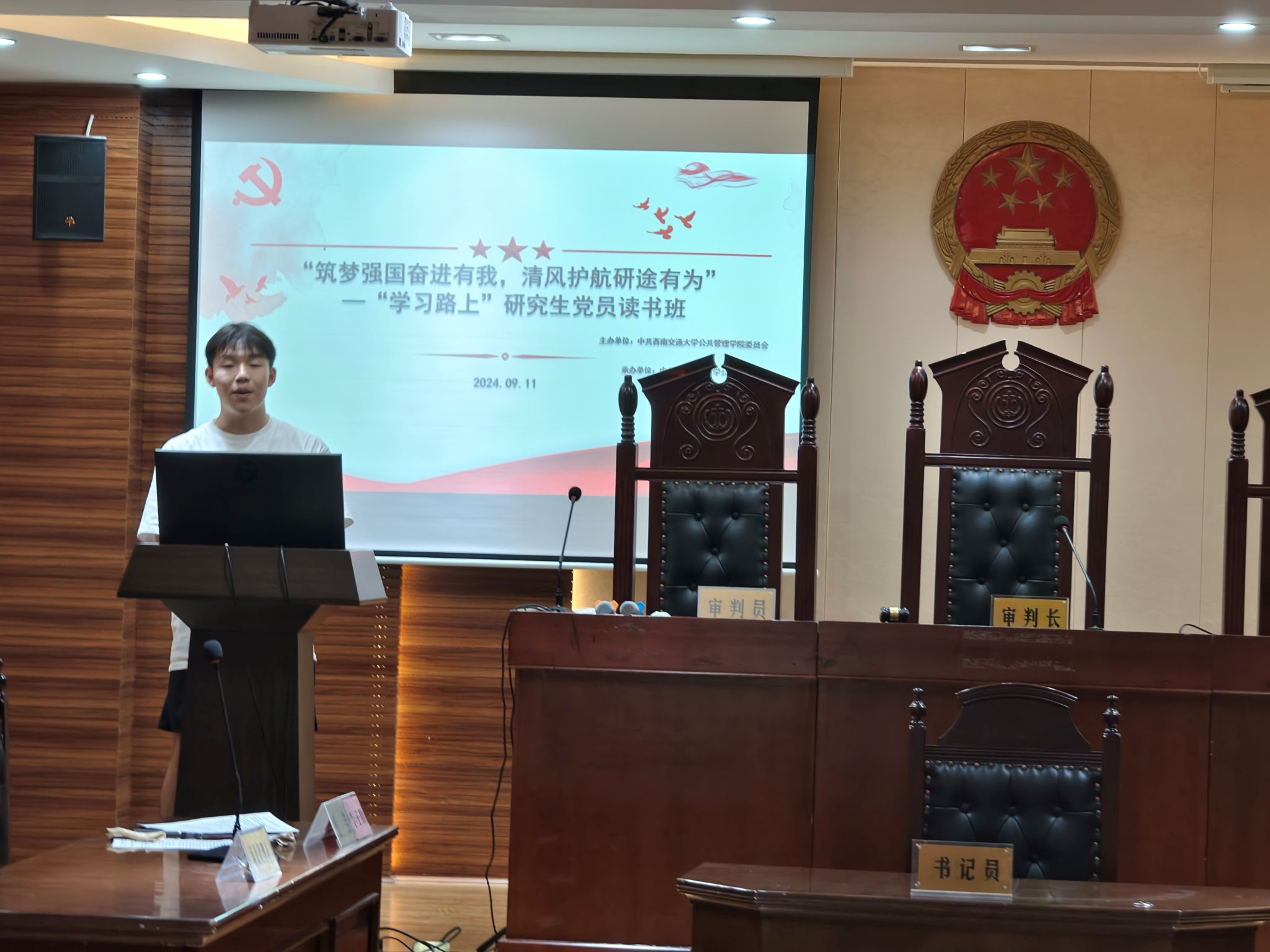 硕士2023级法学第一党支部于2024年9月11日带领硕士2023级法学1班全体同学以线上线下相结合的方式开展了研究生党员读书班暨学习党的二十届三中全会精神专题党日活动。本次活动由党支部书记李子腾同志与纪检委员庞鸿源同志共同主持。