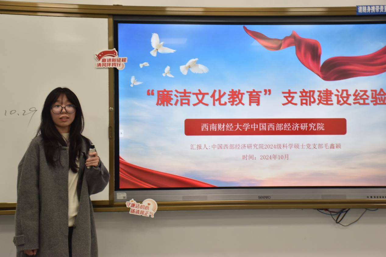 秉持以“廉”促教、以“廉”育人的工作理念,把加强校园廉洁文化建设作为一体推进“三不腐”的基础性工程和落实立德树人根本任务的重要举措,持续深耕校园廉洁文化建设,打造廉洁文化教育阵地,推动清正廉洁政治底色根植人心;成都中医药大学的学生党员代表文莎莎,则是以案例带领大家深入思考,警示同学们不能犯红线错误,要留清白在人间。并在展示的过程中,抛出问题“青年何以清廉”将廉政建设的种子播撒在每个人的心中;最后是西南财经大学的学生党员代表毛鑫硕,鲜明直接的切入主题,分享了在新时代廉洁文化建设中,西南财经大学党支部的角色定位和具体作为。