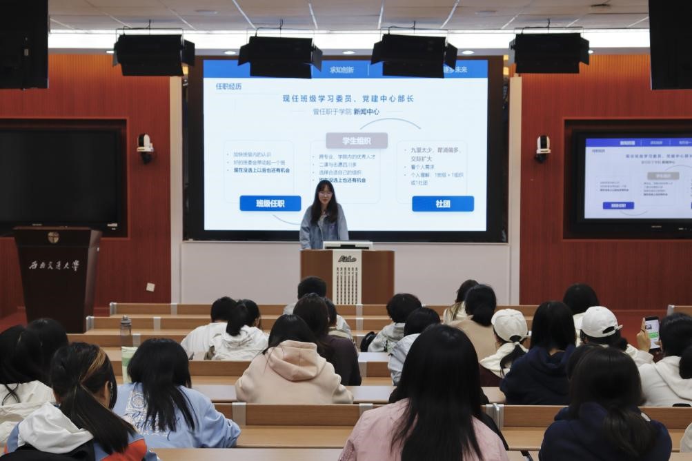 2024年10月11日晚,西南交通大学本科公管党支部于九里校区四号教学楼J4105教室举行了党员代表专业学习经验分享会,支部成员及低年级学生共计70名学生到场参与。本次会议由支部两位保研成功的优秀中共党员华榕、阎梓仪进行专业经验分享。这不仅是一次专业学习的交流,也是党支部活动的一部分,旨在通过优秀党员的示范作用,激励新生树立远大理想,明确学习方向,规范学习行为。