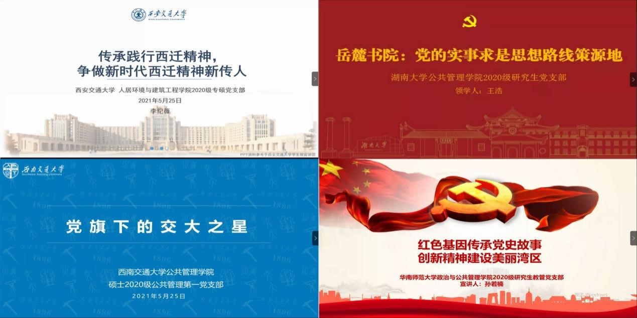 2020级研究生教管党支部孙若楠分别进行了题为《党旗下的交大之星》《岳麓书院:党的实事求是思想路线策源地》《传承践行西迁精神,争做新时代西迁精神新传人》《红色基因传承党史故事,创新精神建设美丽湾区》的主题宣讲,将党史学习教育宣讲与各校校史校情、杰出校友、区域情况和学校精神策源互相结合贯通,让党史学习教育在青年党员中生动鲜活起来,真正发挥高校党史学习教育的鲜明特色和优势。