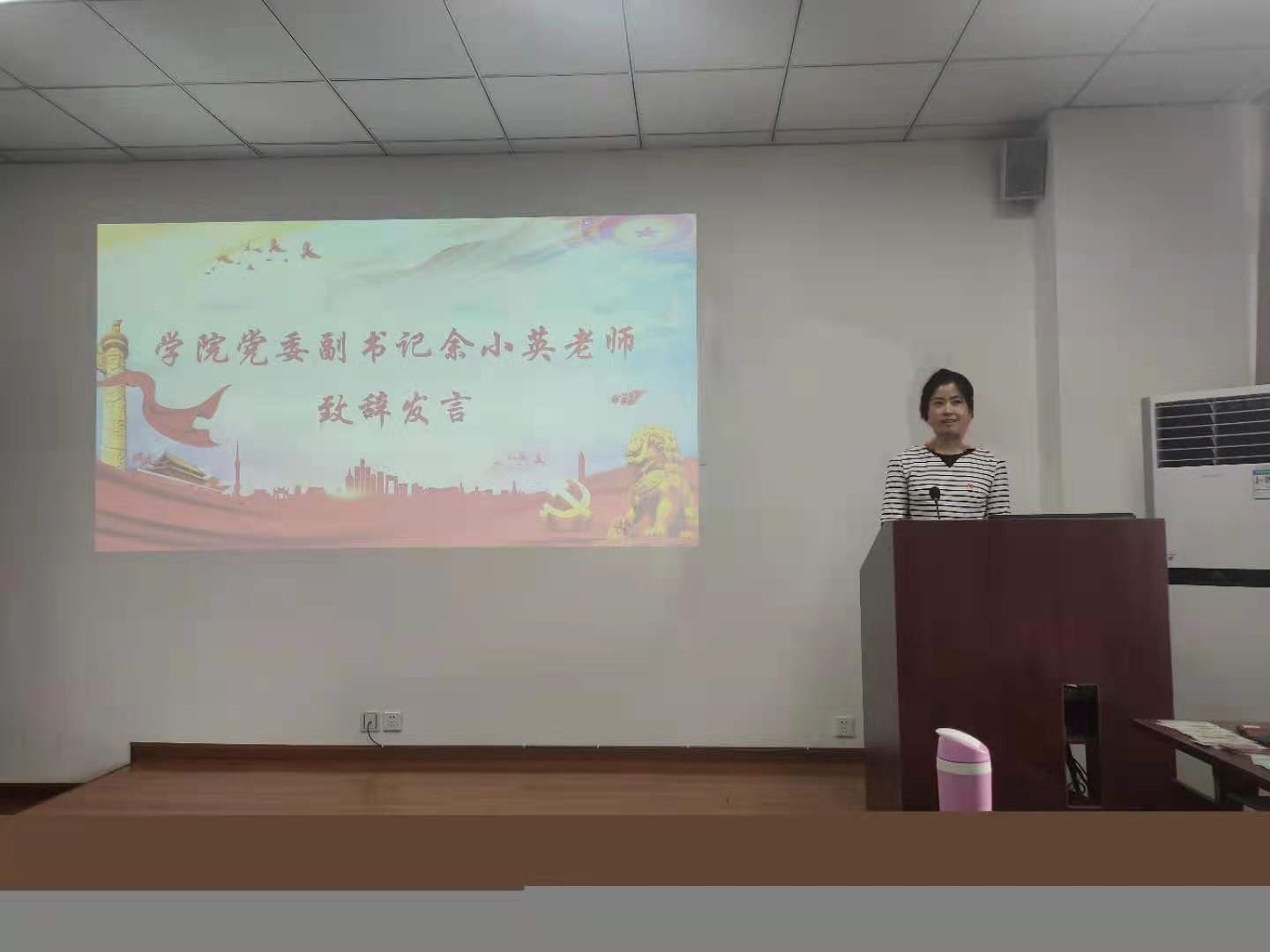 党委副书记余小英老师致辞发言。她谈到,历史是最好的教科书,加强党史学习有助于青年学子更好地理解中国共产党团结带领人民艰苦奋斗、砥砺前行的光辉历程。学生党员秉持“加强党史学习,追溯入党初心”的信念,深入学习党史,用赤诚之心诉说党的故事。