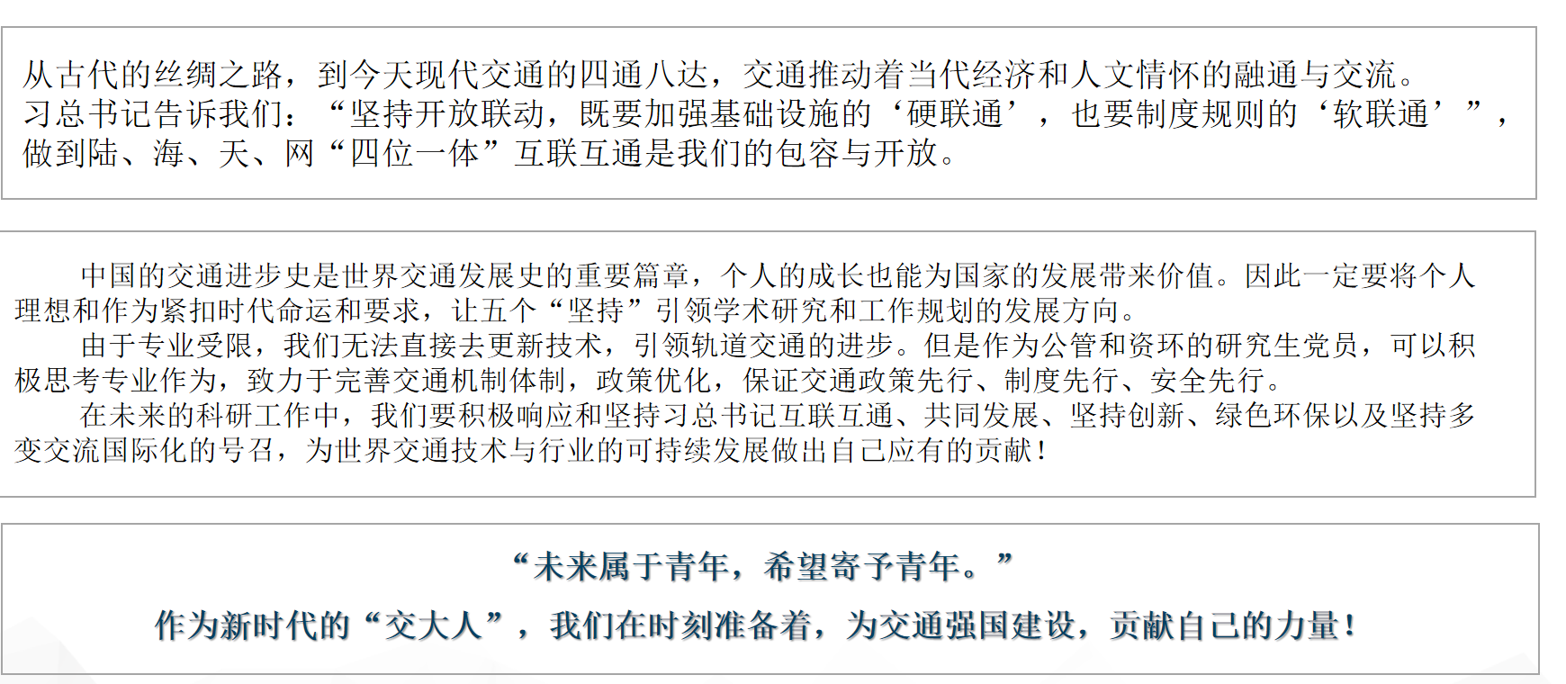 总结:本次交流学习,我们从回忆长征路到了解如今的“交通强国”建设,岁月不居,时节如流,红军长征创造了中外历史的奇迹,而今天的中国依然在书写自己的故事,用大国气概承担着国际责任。中国在发展,时代在进步。作为青年党员的我们,应始终树立“四个自信”,不忘历史、不忘初心,敢于克服困难、勇担时代重任。