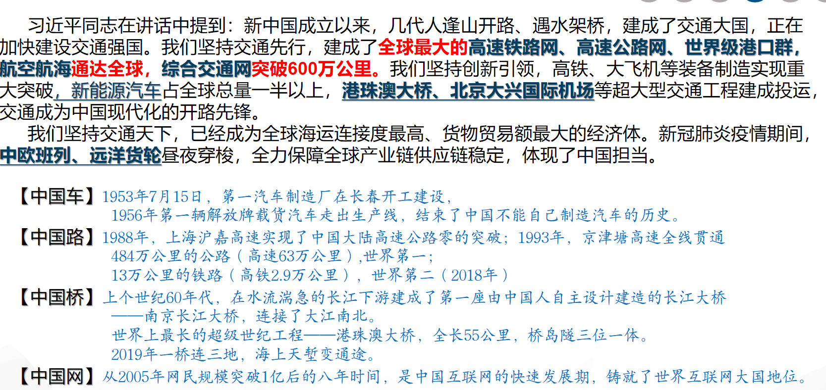 学习感悟:当今世界正在经历新一轮科技革命和产业变革,数字经济、人工智能等新技术、新业态已成为实现经济社会发展的强大技术支撑。书写“联通”“畅通”“沟通”新篇章,以互联互通实现互利共赢。以开放为导向,以合作为动力,以共享为目标,近年来,中国不断构建互联互通、互利共赢的交通融合发展“快车道”,体现了中国与国际社会携手推进全球交通发展、助力落实联合国2030年可持续发展议程的责任与担当。