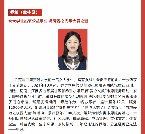 习近平总书记曾经强调:“刀要在石上磨、人要在事上练,不经风雨、不见世面是难以成大器的。”支部青年积极参与学生工作,在校、院两级各学生组织、社团多个岗位上发光发热。他们还积极投身社会实践和志愿服务,在包括成都大运会在内的志愿活动中挥洒蓬勃青春力量、展现交大学子风采。乔楚同学积极投身乡村支教事业,获得2023年四季度“成都好人”荣誉称号,为支部青年注入满满正能量。奉献的青春最美,他们都是可爱的人。