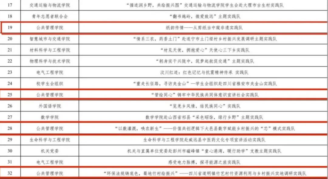 的纸韵传情——从剪纸当中窥非遗实践队、“管绘同心”铸牢中华民族共同体意识宣讲社会实践队、“以数灌溉,唤农新生”——价值共创逻辑下大邑县数字赋能乡村振兴的“芯”模式实践队、“环保法规铸底色,蜀地竹村绘振兴”——四川省道明镇竹艺村竹资源利用与乡村振兴实地调研实践队4支队伍被评为校级优秀实践队伍!