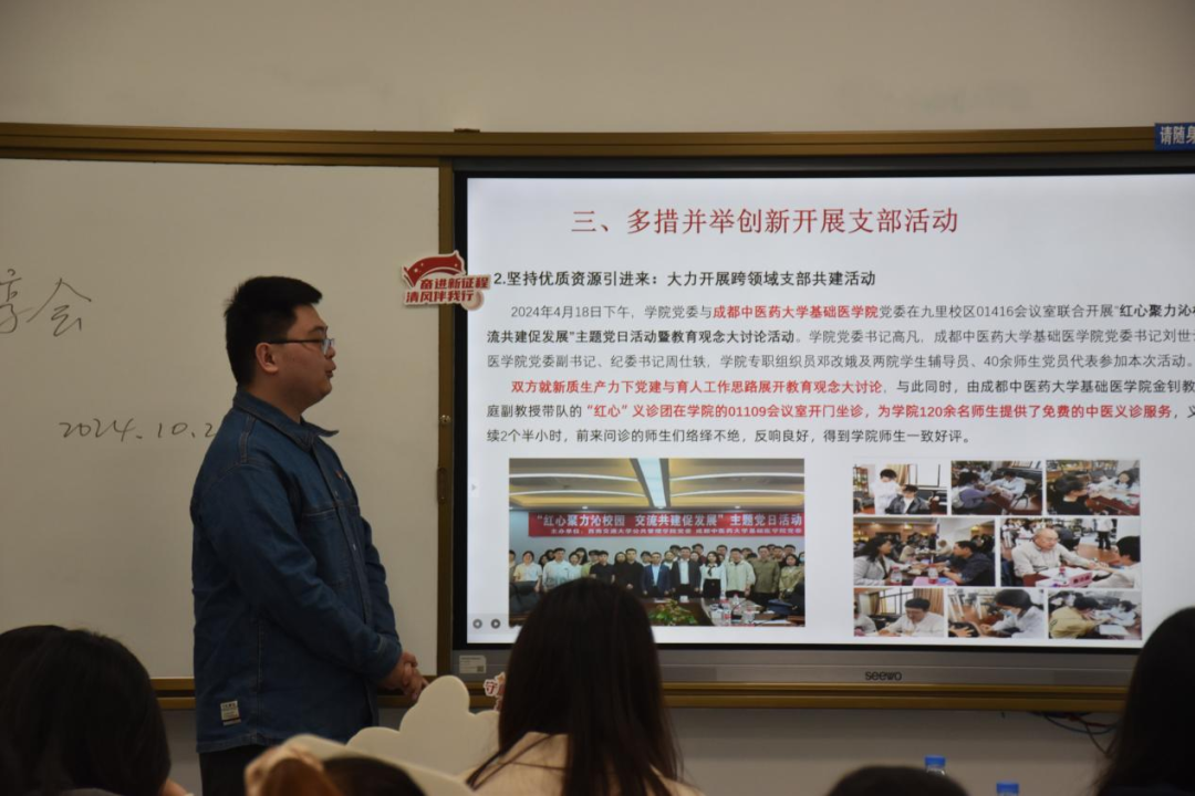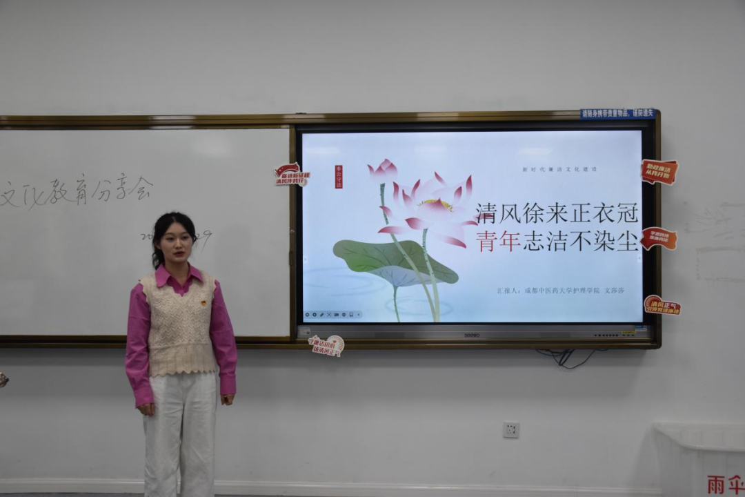 秉持以“廉”促教、以“廉”育人的工作理念,把加强校园廉洁文化建设作为一体推进“三不腐”的基础性工程和落实立德树人根本任务的重要举措,持续深耕校园廉洁文化建设,打造廉洁文化教育阵地,推动清正廉洁政治底色根植人心;成都中医药大学的学生党员代表文莎莎,则是以案例带领大家深入思考,警示同学们不能犯红线错误,要留清白在人间。并在展示的过程中,抛出问题“青年何以清廉”将廉政建设的种子播撒在每个人的心中;最后是西南财经大学的学生党员代表毛鑫硕,鲜明直接的切入主题,分享了在新时代廉洁文化建设中,西南财经大学党支部的角色定位和具体作为。
