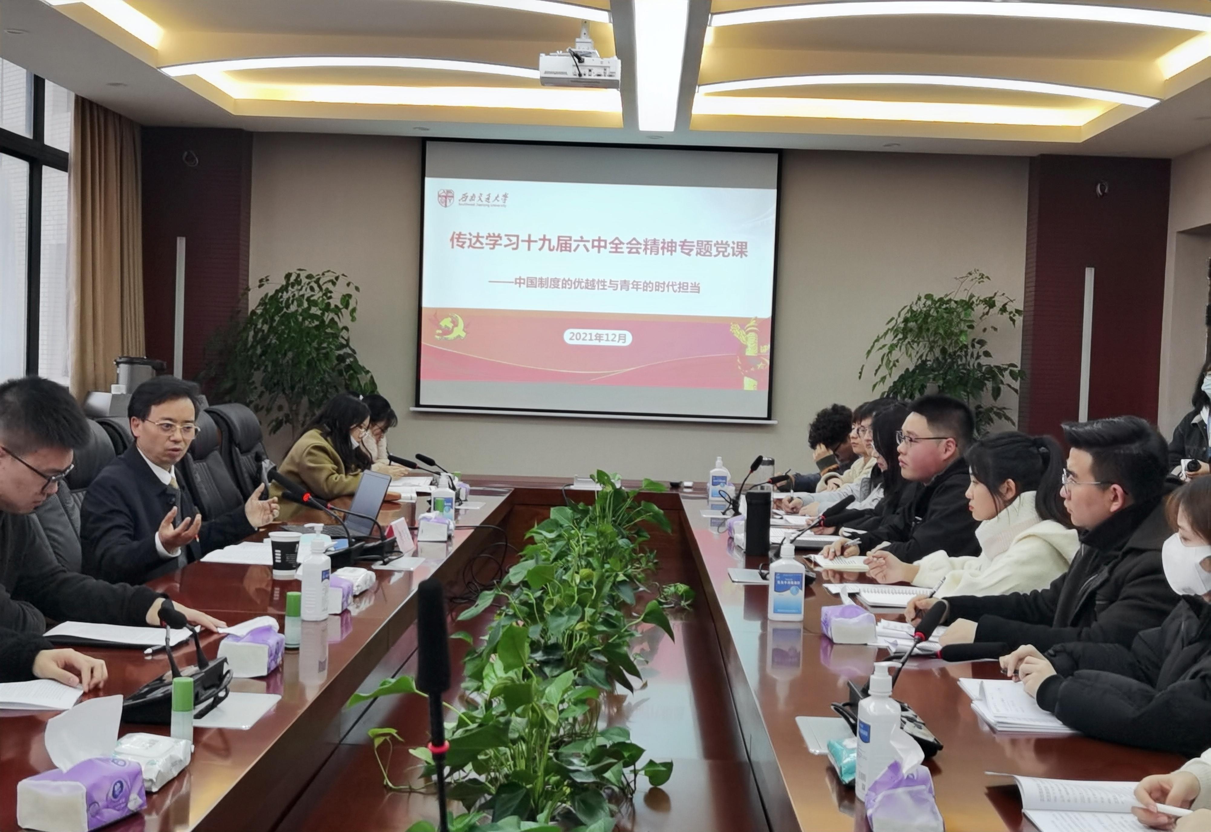 本科第二党支部于2021年12月9日下午4时开展了十九届六中全会精神的专题学习会。本次党课特别邀请到了西南交通大学党委副书记、纪委书记张学龙老师作为主讲嘉宾,与同学们一起深入学习会议精神。