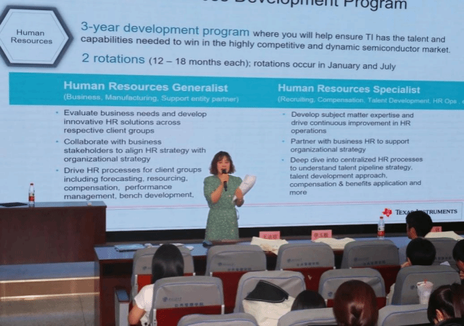 首先,德州仪器相关负责人从招聘者视角为同学们进行职业选择提供方向。她详细分析了目前的就业市场,指出同学们需要从确定自身职业价值观方面入手,选择相关行业。