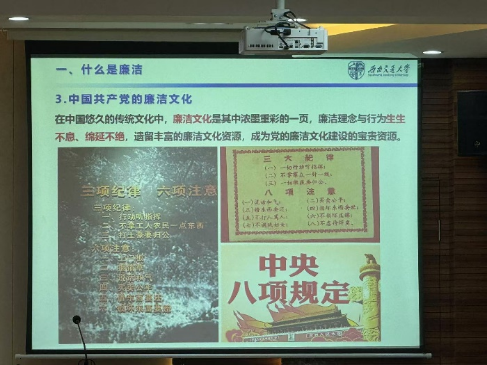 青年讲师团成员胡博老师主讲的大学生廉洁文化及行为规范主题“青马工程”课程。