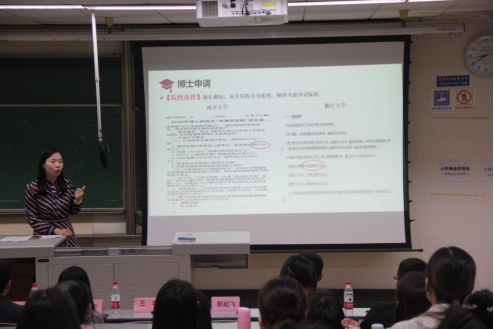 的郭宁学姐,她介绍了申请考核制博士的必备条件、过程与建议,强调同学们要兼有软实力和硬实力,分别细致讲解了申请考核制博士的一般流程,让大家务必充分了解目标学校的信息,鼓励同学们学好英语、坚定读博信心,并且努力锻炼科研能力。