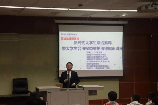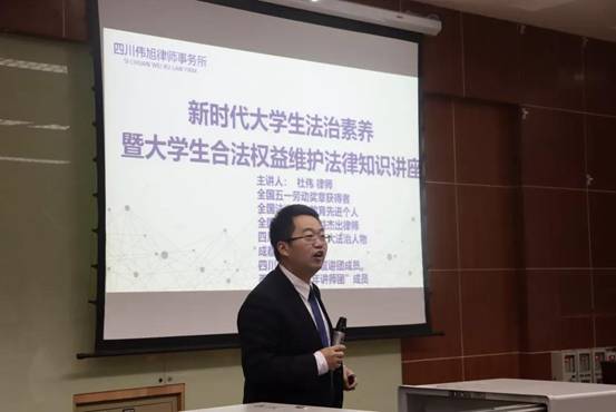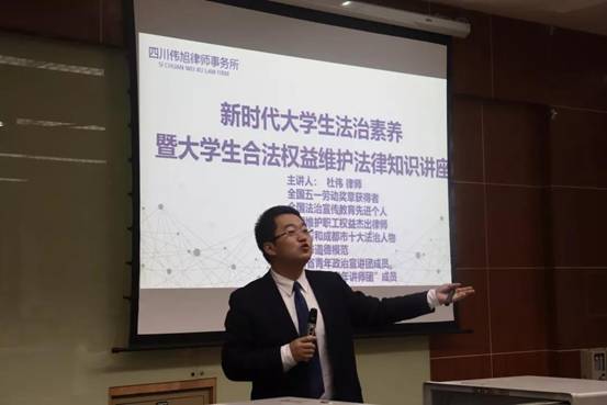 联合承办,主题是新时代大学生的法治素养暨大学生合法权益维护法律知识讲堂。宣讲会由四川伟旭律师事务所主任、2002级法学专业校友杜伟进行主题宣讲。公共管理与政法足彩投注