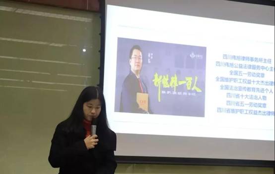 宣讲会伊始,由余书记致辞。她向同学们详细介绍了杜伟律师,为同学们展示了一个优秀的公益律师形象。同时她希望通过此次杜伟律师的讲座丰富青年学生的公益法律知识,让同学们向维护公益的崇高精神靠拢。
