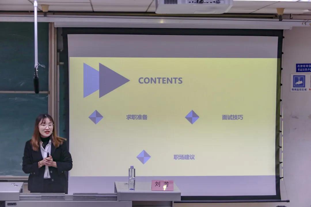 如果说求职前的准备是一场蓄力,那么求职过程中的面试技巧和形象管理可以称之为是与面试官的现场博弈。针对面试过程中常见的五个问题,刘芳师姐传授了一些实用性的技巧,内容涵盖家庭情况描述、业余爱好说明以及自我评价等。同时,她还提醒同学们在回答问题时要本着真诚的态度,“知之为知之,不知为不知”才是“面试人”应当具备的品质。最后,她把“低调做人,高调做事;时刻准备着,眼中有事,手里有活”这句话赠予同学们,鼓励同学们在工作中积极进取。