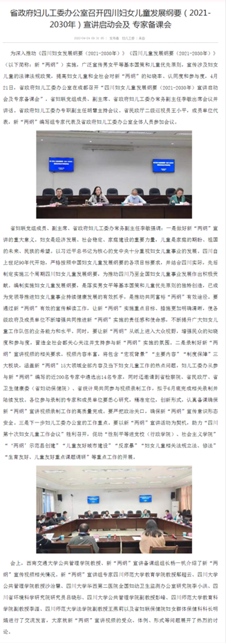 受四川省政府妇女儿童工作委员会委办公室委托,国际老龄科学研究院副院长、老龄事业与产业发展研究中心主任、新“两纲”宣讲备课组组长杨一帆教授,牵头组织开展“四川妇女儿童发展纲要(2021-2030年)宣讲启动会及专家备课会”工作。省妇联党组成员、副主席、省政府妇儿工委办常务副主任李敏出席并作指导讲话。